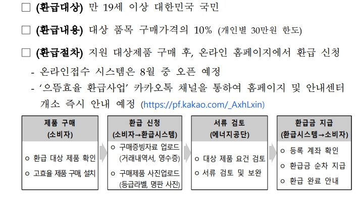 환급 신청은 8월 13일부터 전용 홈페이지(https://www.으뜸효율.kr)에서 가능하며, 신청자는 본인 확인과 서류 검토를 거쳐 8월 20일부터 순차적으로 환급금을 지급받게 됩니다.