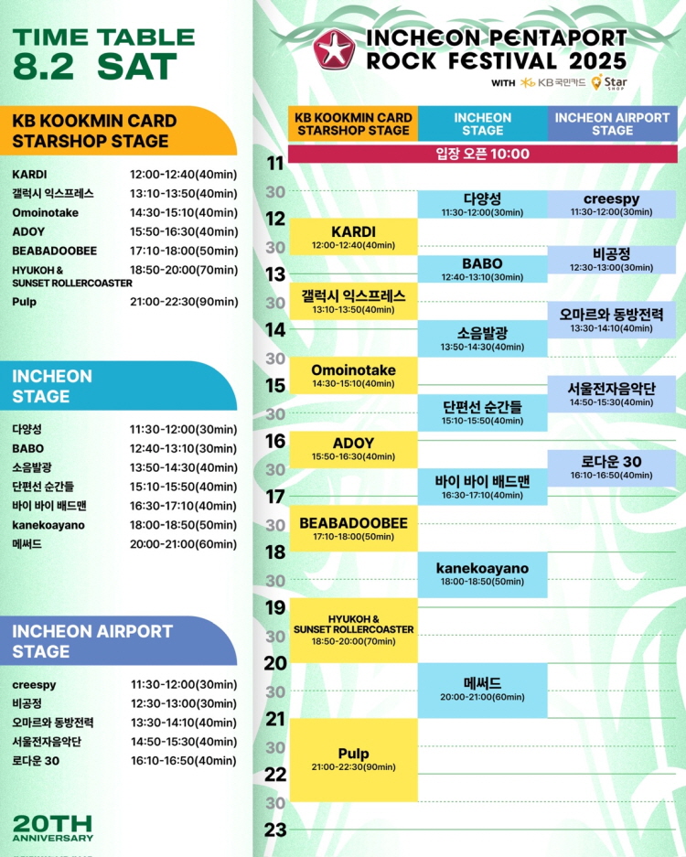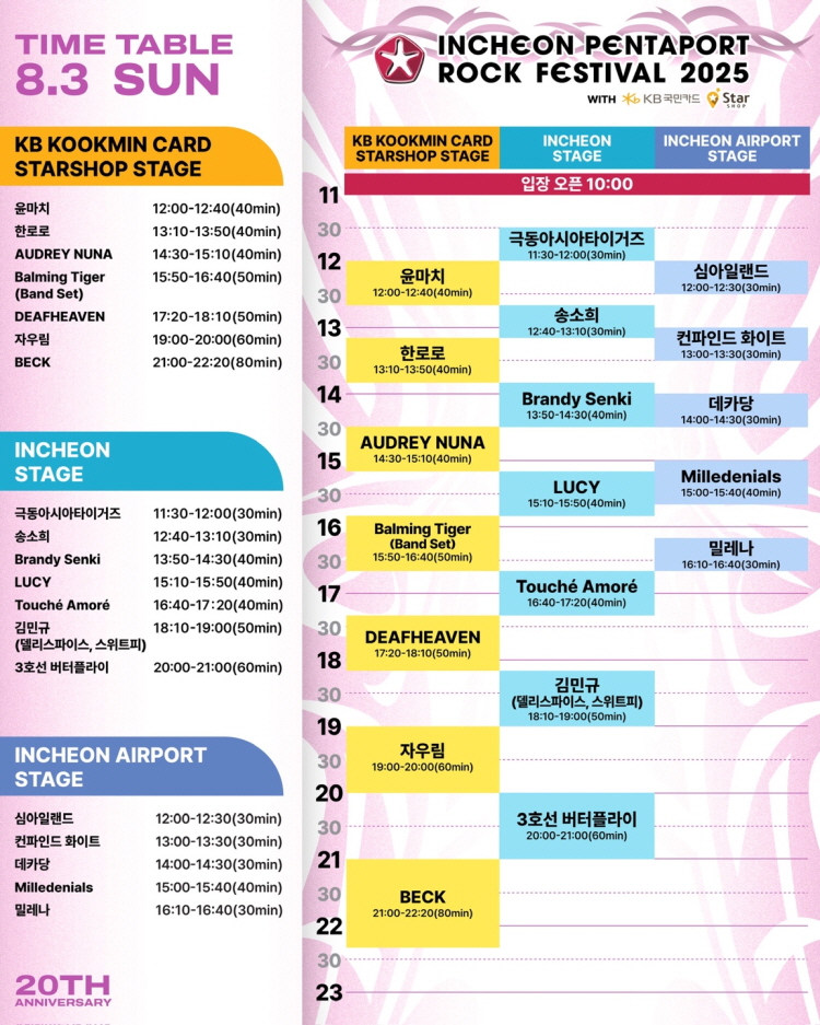 합리적인 티켓 가격, 탄탄한 해외 아티스트 라인업, 그리고 20주년을 맞아 업그레이드된 프로그램까지! 2025 인천 펜타포트 락 페스티벌은 올여름 가장 뜨거운 현장이 될 것입니다.